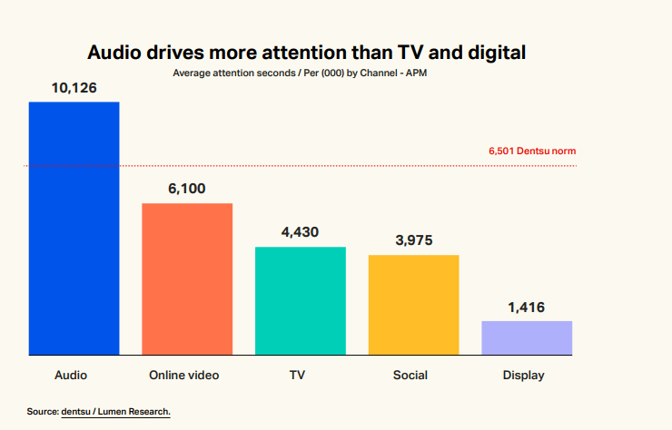 Audio ads create significantly higher attention rates than other media: 10,126 Average Persons Reached per Million vs. 6,501 industry norm