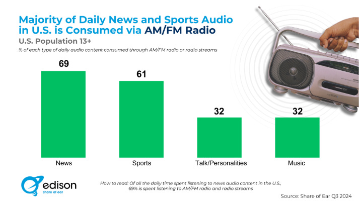 A survey released by Edison Research, Share of Ear®, reports that almost 70% of Americans still listen to traditional radio for news and sports in 2025, while the digital revolution is taking over.