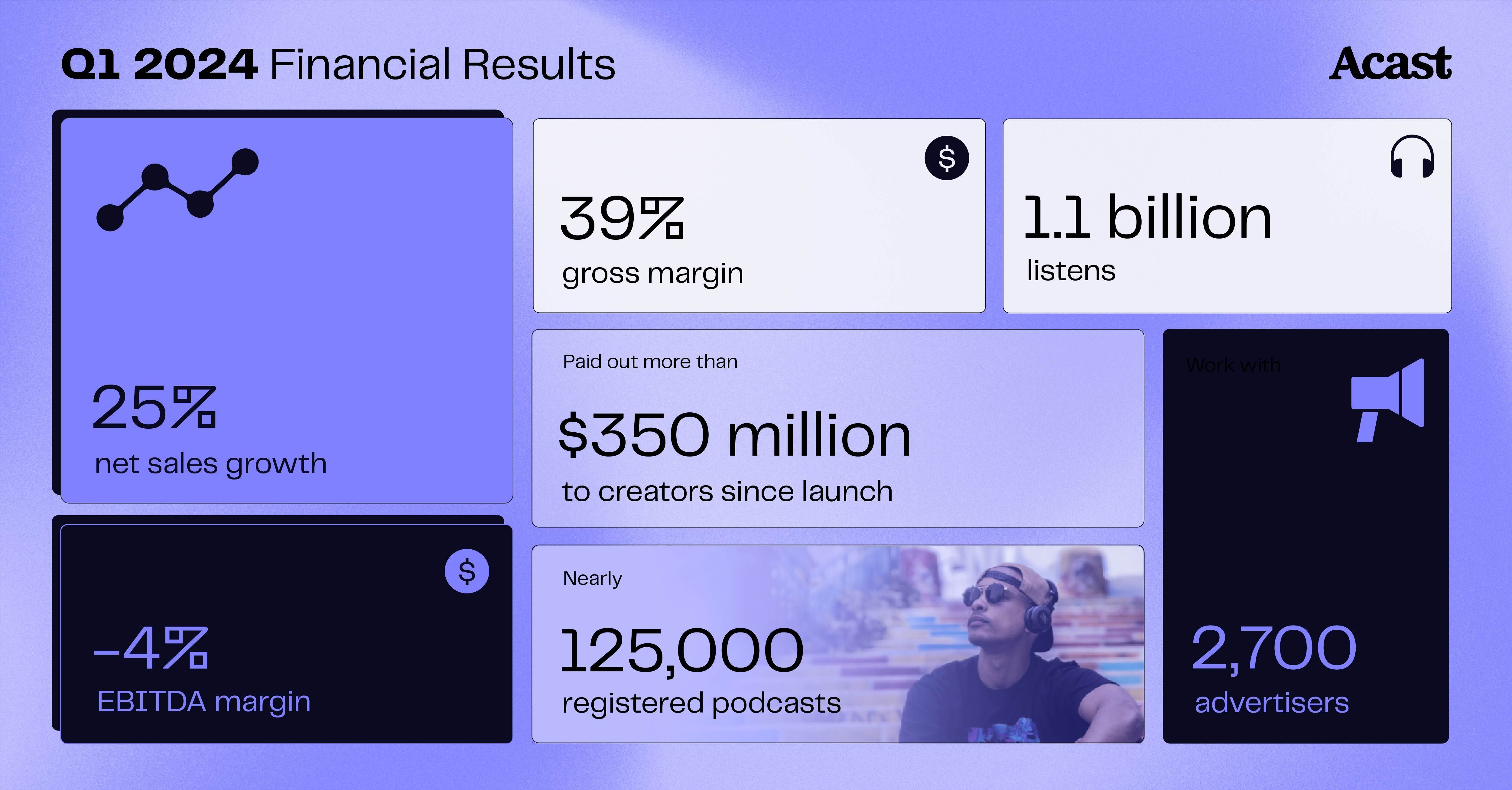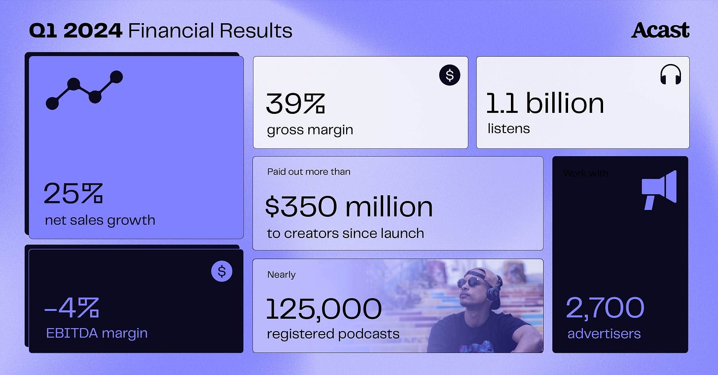 🎧Acast Reports 25% Sales Growth in Q1 2024, Despite 12% Drop in Listens