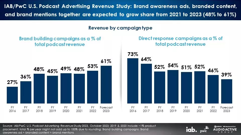 Research from Nielsen demonstrates the effectiveness of brand-based podcast advertising, as reported in Westwood One's weekly blog. According to IAB/PwC's annual podcast ad revenue report, brand-building advertising has gradually displaced direct response marketing as claiming the largest share of podcast ad spend, up from 27% in 2016 to an estimated 61% for 2023.