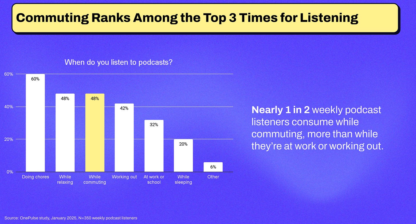 Acast's findings give creators and advertisers a big opportunity to focus on commute-time slots. The data proves that these listeners are more engaged and receptive to both content and advertising than the average podcast consumer.