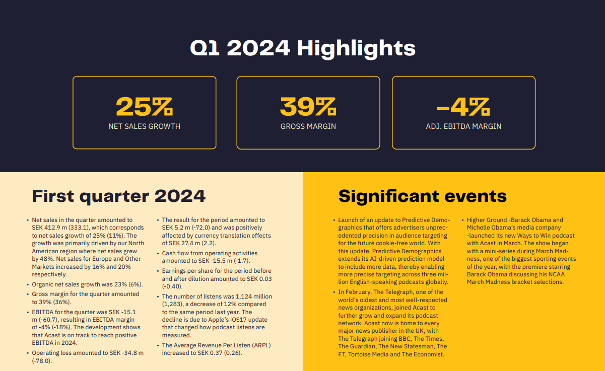 Acast, a leading independent podcast company, experienced a positive start to the year with a net sales growth of 25% (11%), primarily driven by the North American region. The growth was primarily driven by improved sentiment among advertisers and positive returns from investments in the region. Acast's gross margin for the quarter was 39% (36%), and EBITDA for the quarter was SEK -15.1 m (-60.7), resulting in an EBITDA margin of -4% (-18%).