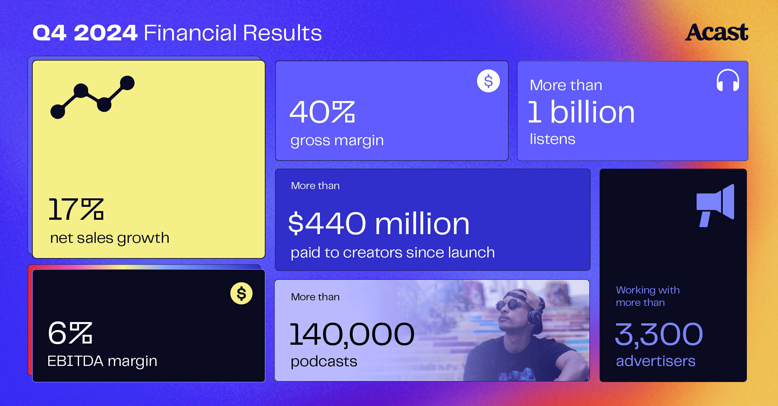 Acast reached a positive EBITDA of SEK 34.5m in Q4 2024, signifying a historic move towards profitability in the podcast industry.