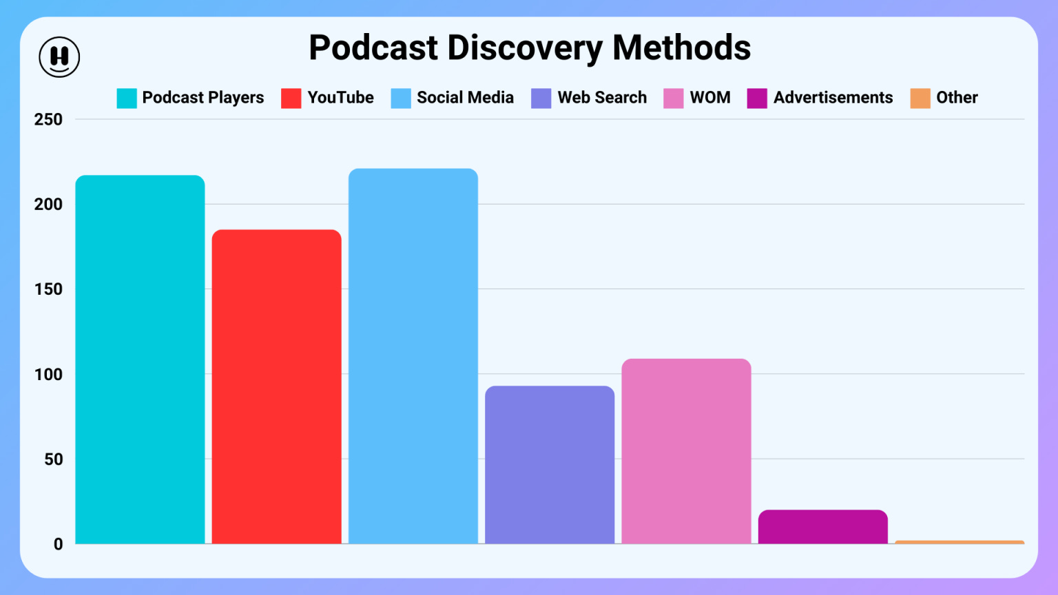 We also looked at trends in podcast discovery and consumption. While 60% of the respondents used only podcast players, the remaining 75% listened to podcasts on YouTube. Social media, at 71%, became the most popular discovery method, surpassing the podcast players with 70%, YouTube with 59%, WOM, and personal recommendations with 33%.