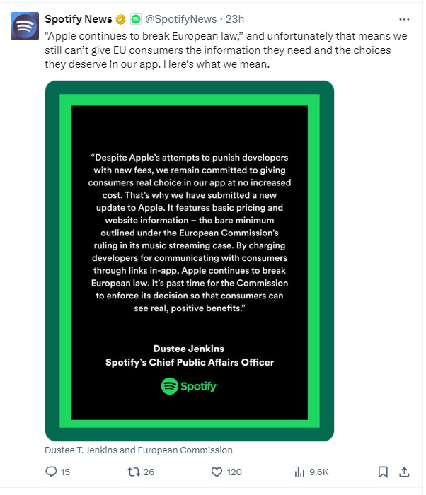 Spotify tests how its iOS app will change post-DMA. Spotify submitted an update for Apple's approval to display "basic pricing and website information" on its European app and "the bare minimum outlined under the European Commission's ruling in its music streaming case."