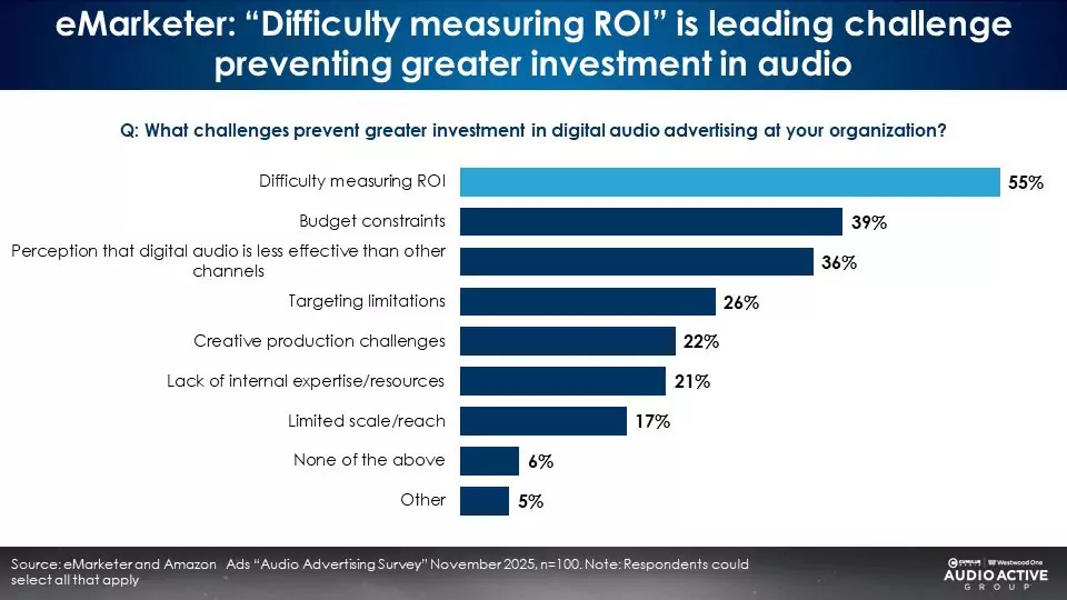 55% of advertisers cite âdifficulty measuring ROIâ as the barrier to audio investment, while 36% believe audio is less effective than other channelsâyet this perception exists despite dozens of published measurement studies proving audioâs effectiveness