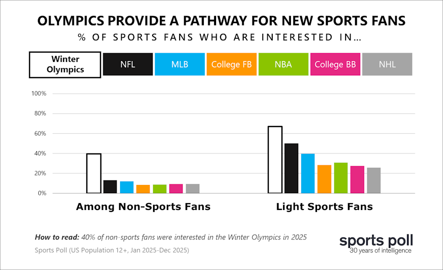 The Olympics generate significantly more interest than any professional or collegiate sports league among non-sports fans and light sports fans, a pattern that has held consistent for over 30 years of Sports Poll tracking