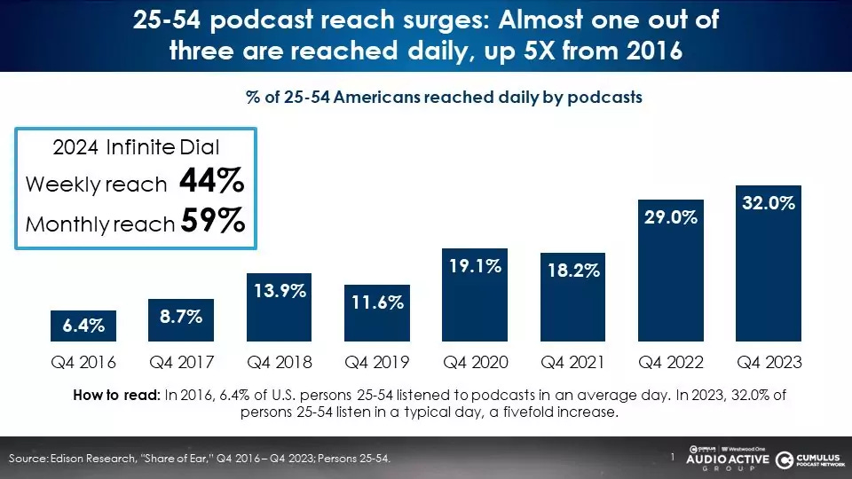 Cumulus Media's 2024 Audioscape report found that 32% of U.S. 25-54s listen to podcasts daily. Edison’s “Infinite Dial” study reports that 25-54 weekly podcast reach is 44% and 59% listen monthly.
