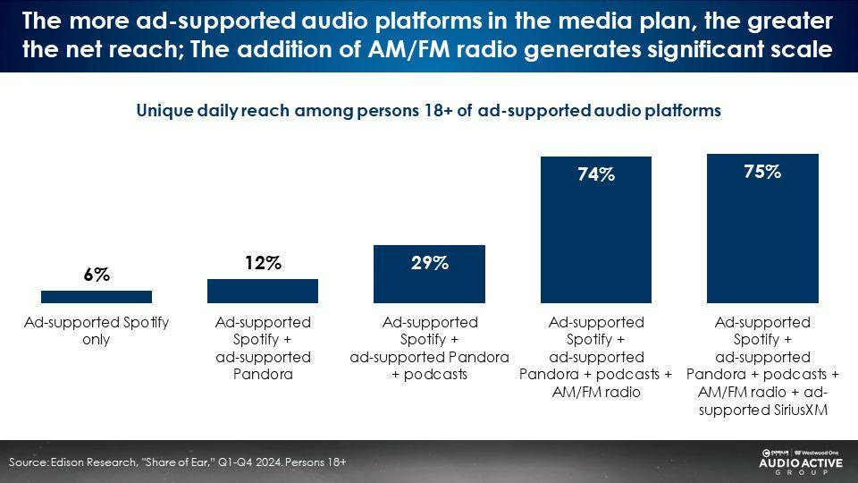 Edison Research's Q4 2024 "Share of Ear" study shows that audio media plans that exclude AM/FM radio miss about two-thirds of American audiences. Podcasts have become the second most significant ad-supported audio medium, accounting for 19% of ad-supported audio consumption in America.