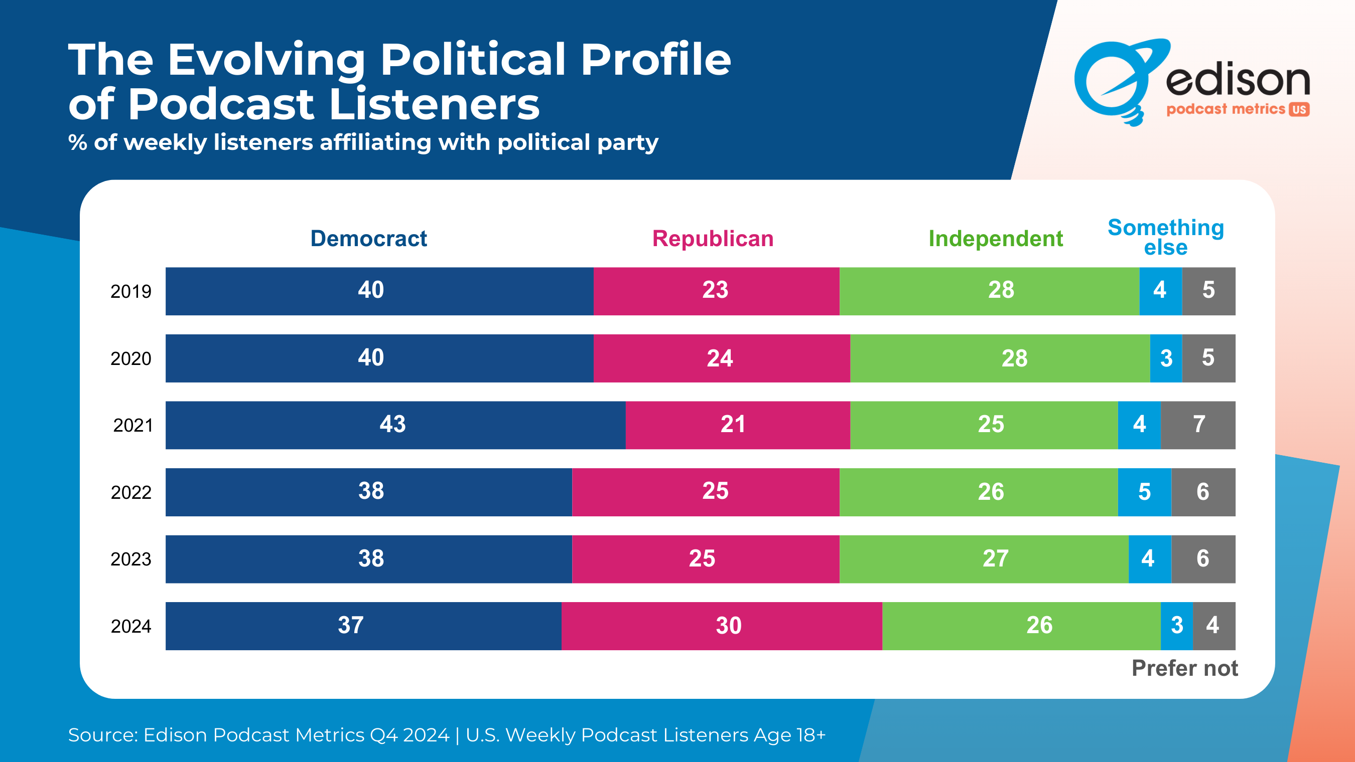 Podcast audiences are transitioning from being predominantly left-leaning to having a more equal distribution across the political spectrum. Edison Podcast Metrics shows that the 17-point gap between Democrat and Republican listeners in 2019 has narrowed to just 7 points in 2024, showing that podcasts are becoming more widely accepted across different political beliefs, providing content creators with opportunities to cater to a diverse audience, encouraging more engagement and inclusivity.