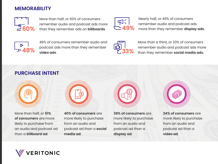 Results showed that more than half of the consumers remember advertisements through audio and podcasts more than on billboards; 49% of the consumers remember the ads more through audio and podcasts as opposed to display ads; 48%, more on audio and podcast ads compared to video ads; and 33%, ads on audio and podcasts more than on social media.