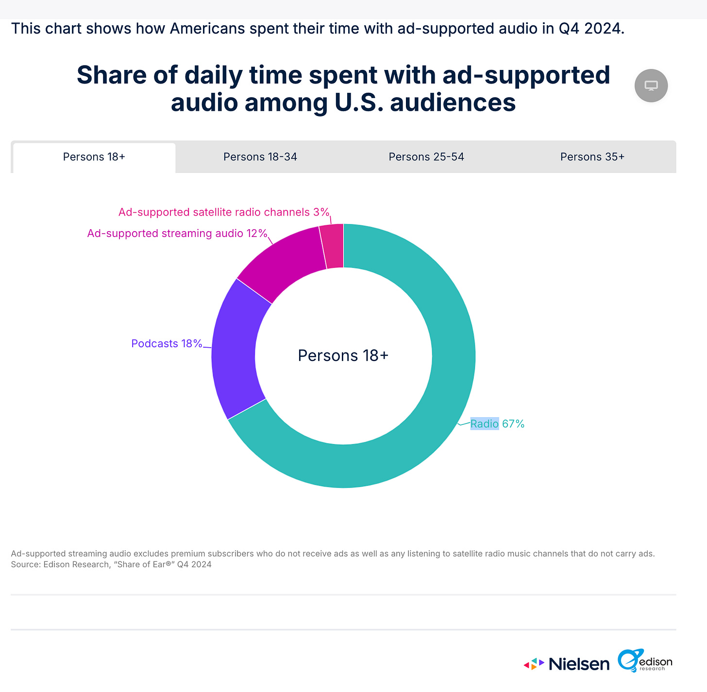 Radio held a 67% share of ad-supported audio, while podcasts followed closely behind with 18%.