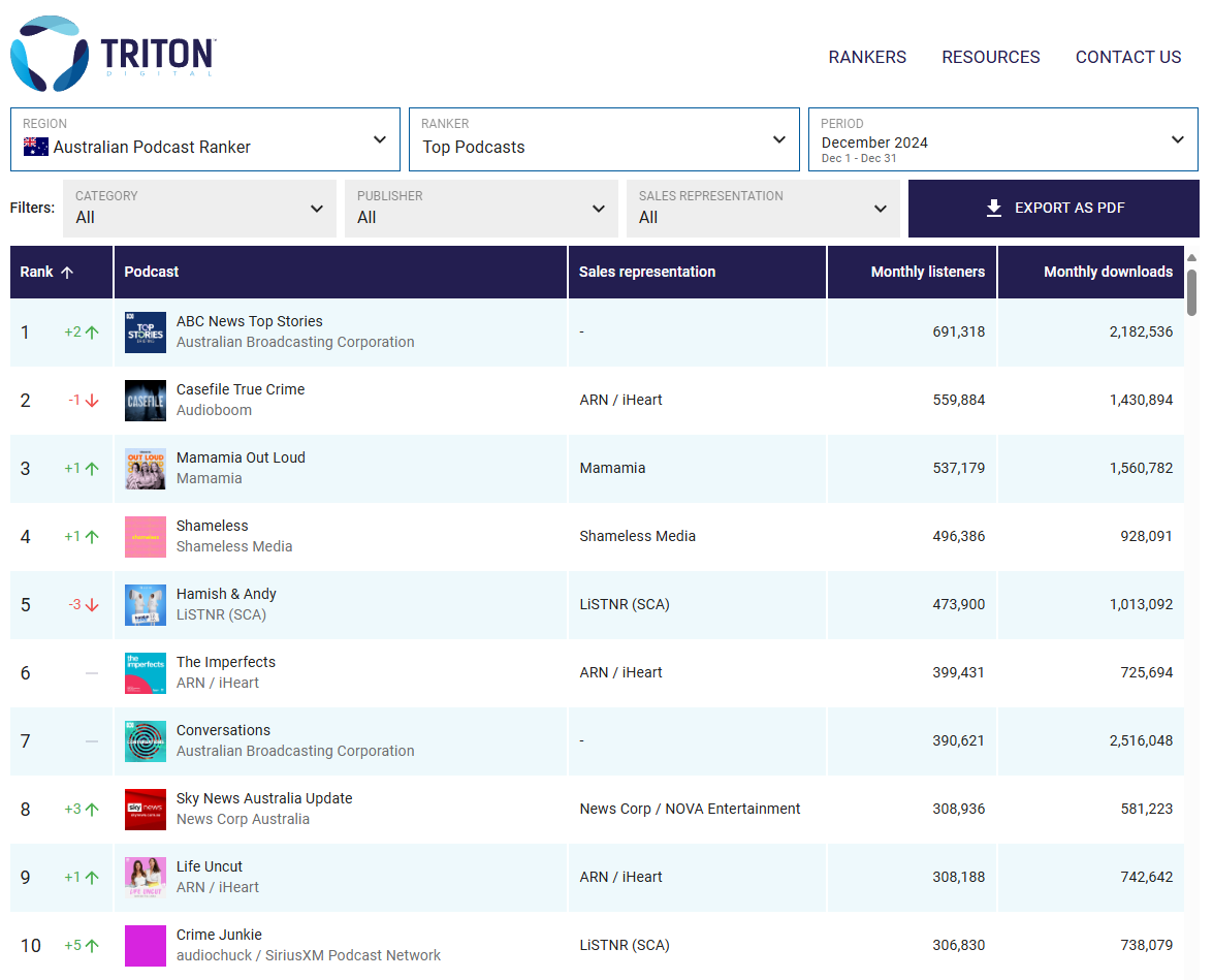 Meanwhile, domestic powerhouse ABC News Top Stories topped the top spots, showcasing the strong appetite for local news content. According to Triton Digital®, a leading global technology and services provider in digital audio, podcast, and broadcast radio industries, The data covers December 1-31, 2024, and includes input from over 30 major publishers, including established networks like ARN/iHeart and ABC.