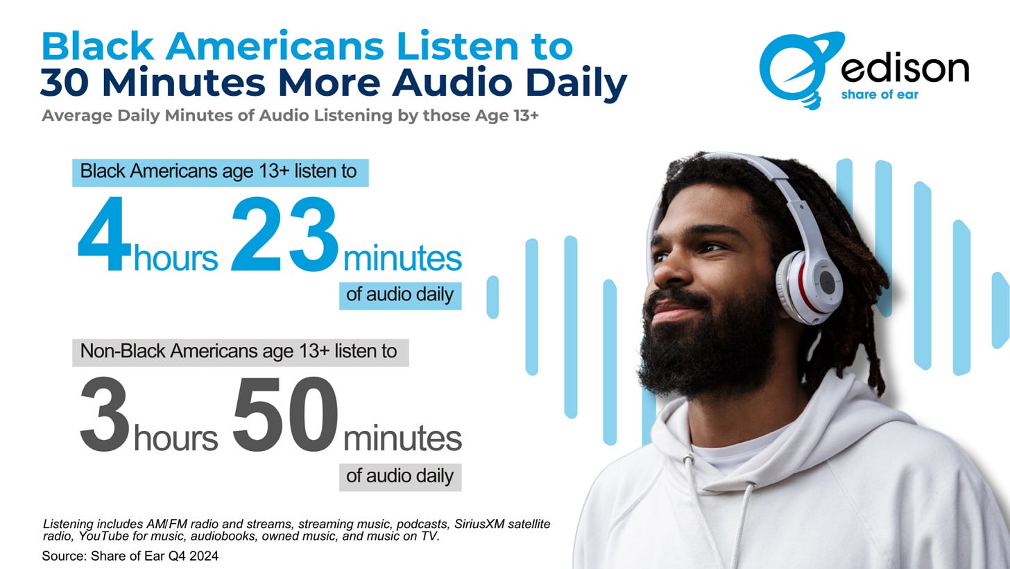 Black listeners invest 4 hours and 23 minutes daily in audio content, surpassing non-Black listeners by over 30 minutes