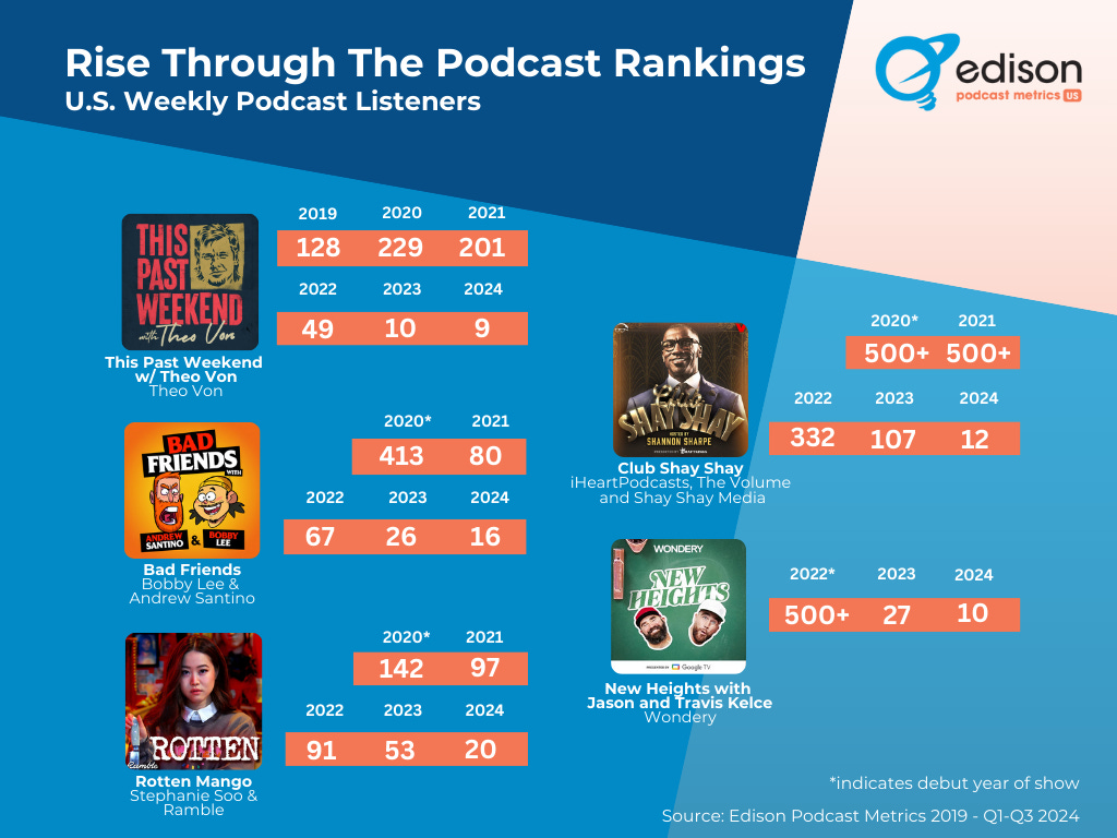 Shows like "This Past Weekend w/Theo Von" climbed from #128 to #9