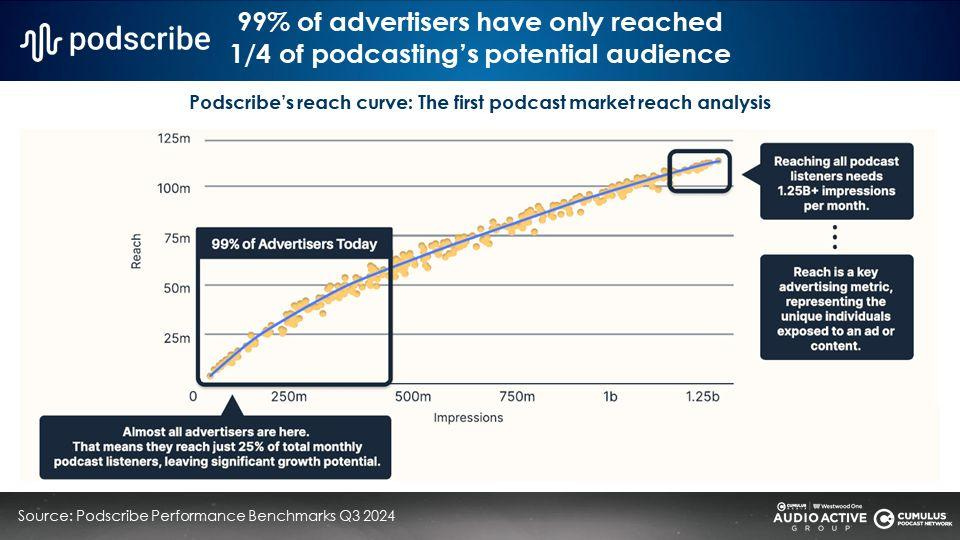 Most podcast advertisers are reaching less than 25% of monthly podcast audiences, with current campaigns running below 500M monthly impressions