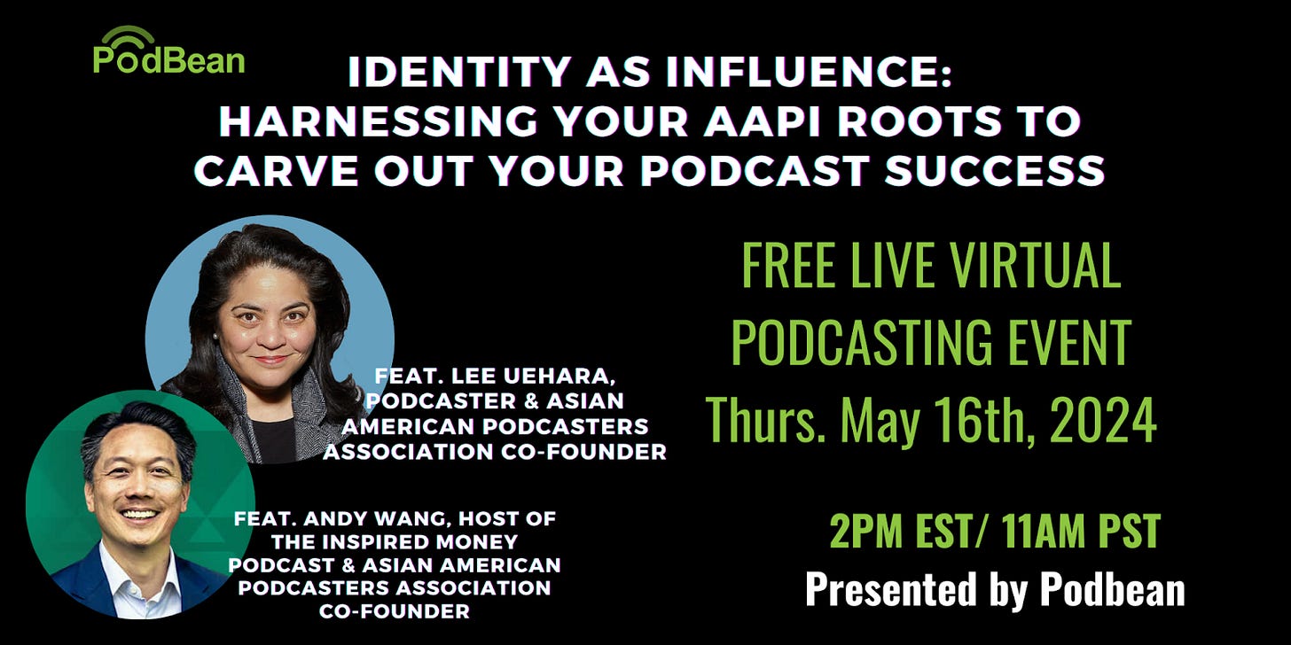 This Asian American and Pacific Islander Heritage Month, join us on May 16th for a groundbreaking virtual event, "Identity as Influence: Harnessing Your AAPI Roots for Podcasting Success," presented by Podbean. The event will feature prominent podcasters and co-founders of the Asian American Podcast Association and Golden Crane Awards, Lee Uehara and Andy Wang, who will share their insights on leveraging AAPI identity to carve a niche in the podcasting industry.