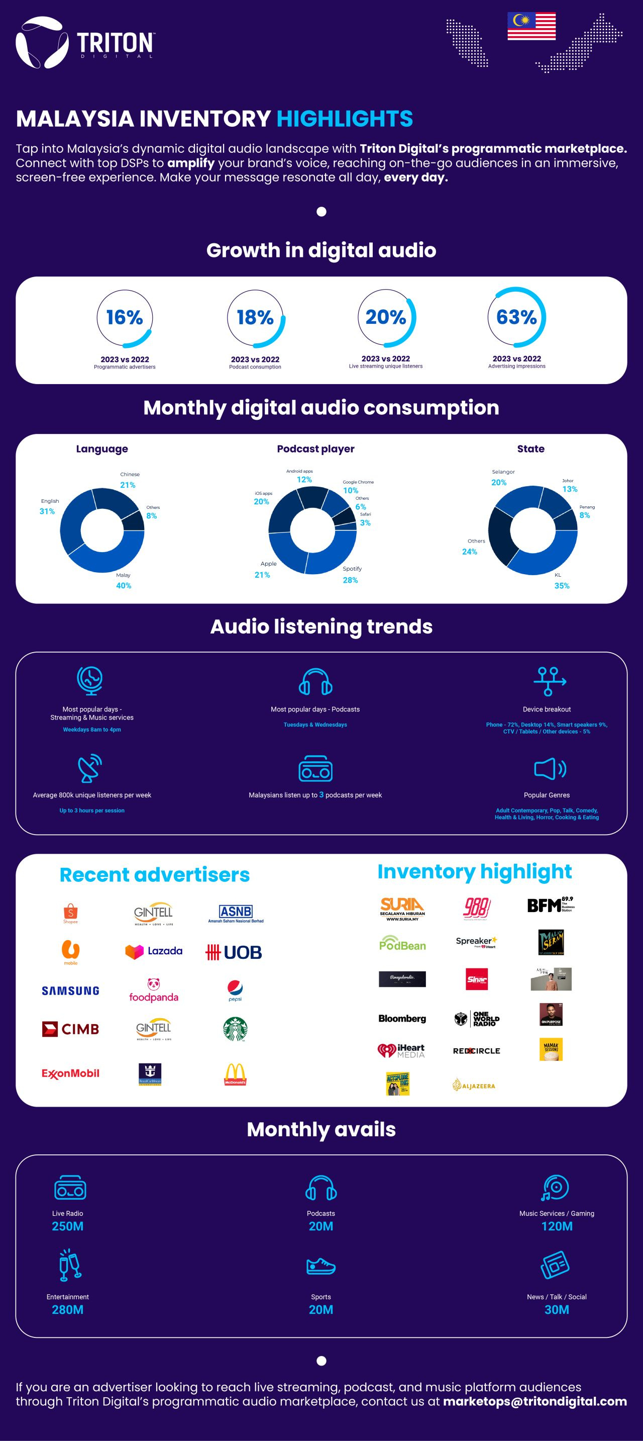 The latest insight from Triton Digital, investigating Malaysia's dynamic digital audio landscape with Triton Digital's programmatic marketplace, reveled that programmatic advertisers are now at 16 per cent, while ad impression rests at 63 per cent and podcast consumption at 18 per cent.