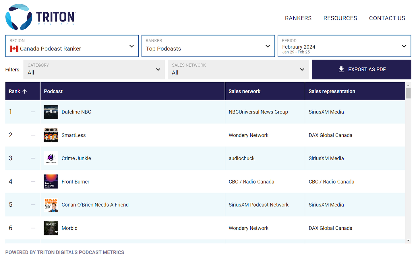 💥 Triton Digital Releases the February 2024 Canada Podcast Ranker