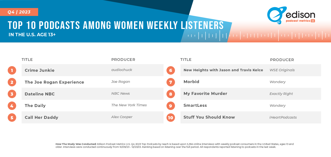 The podcast with the largest weekly reach of women weekly podcast listeners age 13+ in the U.S. is the true crime podcast Crime Junkie hosted by Ashley Flowers with Brit Prawat, and launched in December of 2017. Crime Junkie consistently ranks at the top of the podcast charts quarter after quarter, and currently sits at the #2 spot among all weekly podcast listeners in the U.S. The Joe Rogan Experience, the top podcast in the U.S. overall, is #2 among U.S. women, and true crime pod Dateline NBC ranks #3. [Source ]