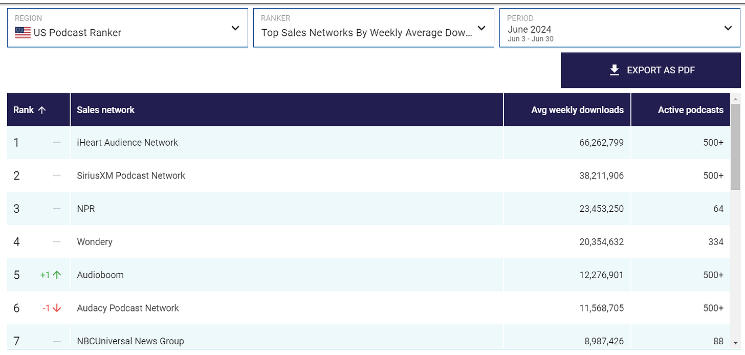 For June 2024, iHeart Audience Network claimed again the top spot on the Top Sales Networks Report with 66.3 million average weekly downloads and 18.3 million average weekly users. US Podcast Ranker: Triton Digital is out with its June 2024 data.
