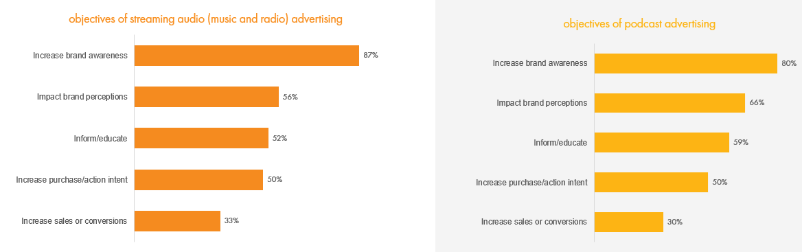 Brand building was again named as the dominant campaign objective for media agencies using digital audio advertising (87% using streaming audio and 80% using podcast advertising for brand awareness), with fewer buyers using it for lower funnel activities such as increasing sales or conversions (33% for streaming and 30% for podcast). Audience attention and engagement was seen to be the key driver for audio investment (62%) followed by incremental reach (52%) and ability to complement other media (50%). These last two point towards the power of audio to supplement other channels, a power that is not lost on buyers with eight in ten media agencies commonly buying digital audio advertising in combination with other media, most often with other digital display advertising (including digital video).