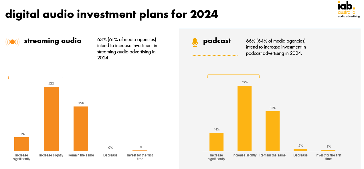 Gai Le Roy, CEO of IAB Australia commented: “Over the last 12 months, digital audio and podcasting has been one of the fastest growing areas of the digital advertising ecosystem and the results in the latest Audio Advertising State of the Nation Report indicate that this will continue throughout 2024. With buyers appreciating the complementary nature of audio with other digital opportunities, we are likely to see digital being increasingly included in omni-channel campaigns and welcoming a range of new advertisers to the power of audio advertising. “