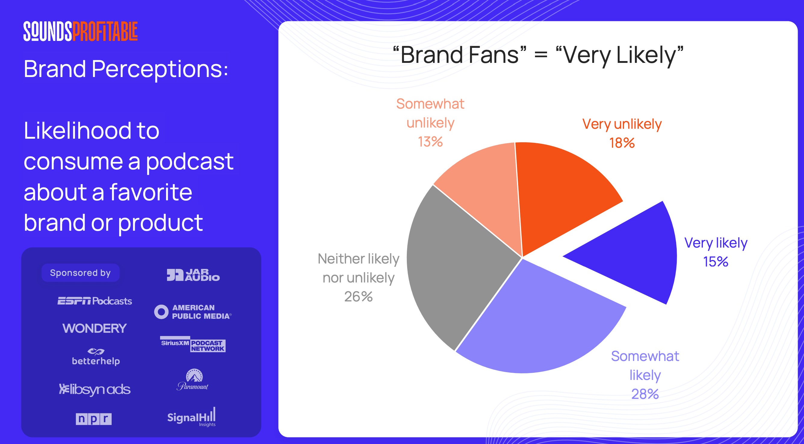- 15% of respondents are "Very Likely" to consume podcasts about favorite brands, with an additional 28% being "Somewhat Likely" - showing substantial interest in brand-focused content