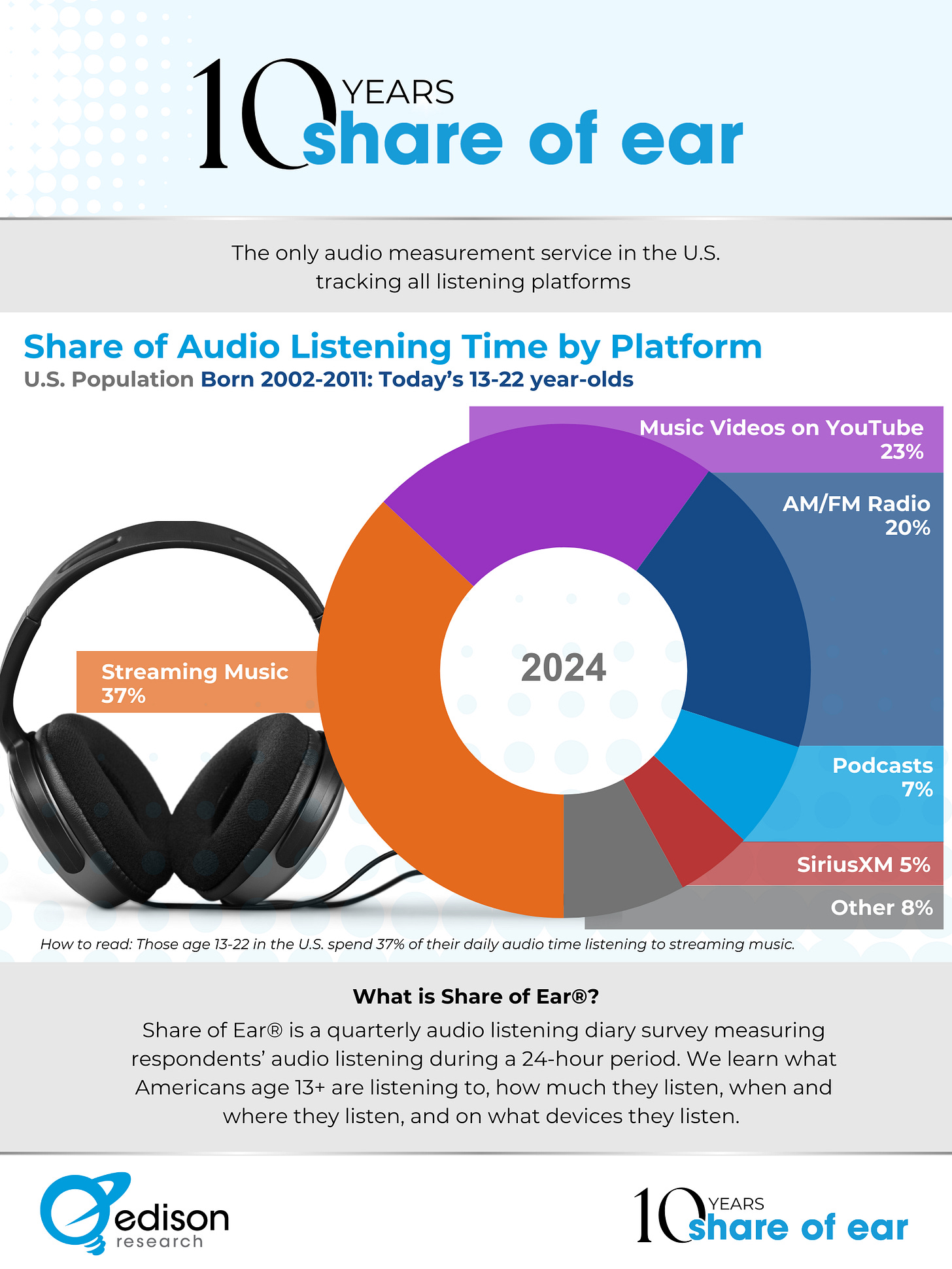 As we celebrate the 10-year anniversary, Edison Research's Share of Ear® study conducted between 2002 and 2011 reveals that today's 13- to 22-year-olds are spending more time listening to music on Spotify, 22% and YouTube, as opposed to AM/FM Radio at 20%.