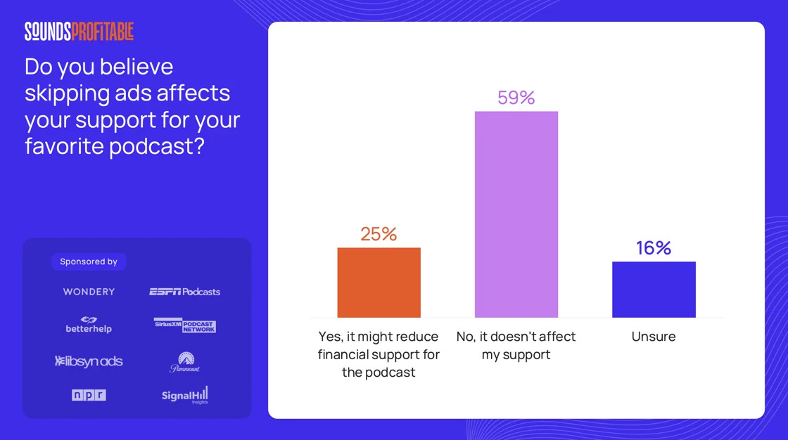 One of Ad Nauseam's surprising findings is that three-quarters of podcast listeners don't believe or know that ad-skipping hurts their favorite podcast. This disconnection is quite unusual, as people often establish a positive connection between the brands that advertise on their preferred podcasts and the support these brands provide for their favorite creators. Listeners clearly grasp the positive elements of this connection. Removing that support by skipping brand messages, however, might hurt the creator.