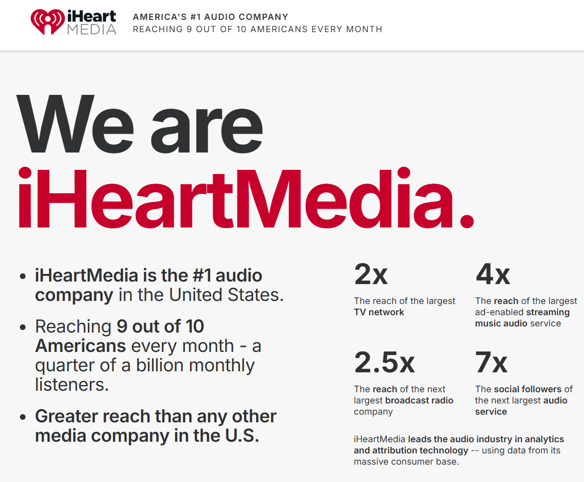 iHeartMedia, Inc. [Nasdaq: IHRT] is the leading audio media company in America, with 90% of Americans listening to iHeart broadcast radio in every month. iHeart’s broadcast radio assets alone have a larger audience in the U.S. than any other media outlet; twice the size of the next largest broadcast radio company; and over four times the ad-enabled audience of the largest digital only audio service. iHeart is the largest podcast publisher according to Podtrac, with more downloads than the next two podcast publishers combined, has the most recognizable live events across all genres of music, has the number one social footprint among audio players, with seven times more followers than the next audio media brand, and is the only fully integrated audio ad tech solution across broadcast, streaming and podcasts. The company continues to leverage its strong audience connection and unparalleled consumer reach to build new platforms, products and services. Visit iHeartMedia.com for more company information.