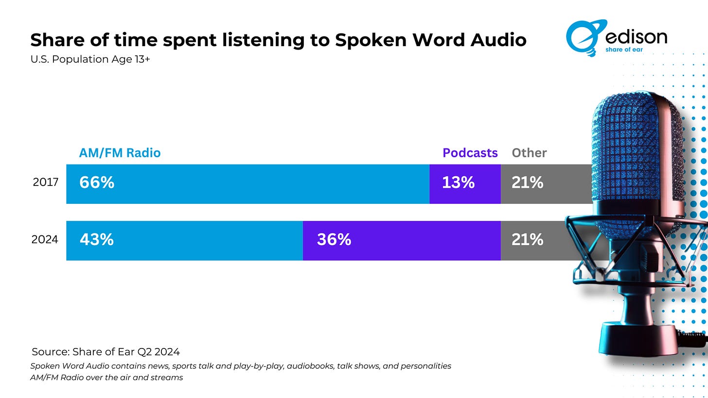 Today, it still makes up 43% of spoken word listening, while podcasts account for 36%. Podcasting has grown from 53% to 7% in just the last seven years and may pass AM/FM in a few years.