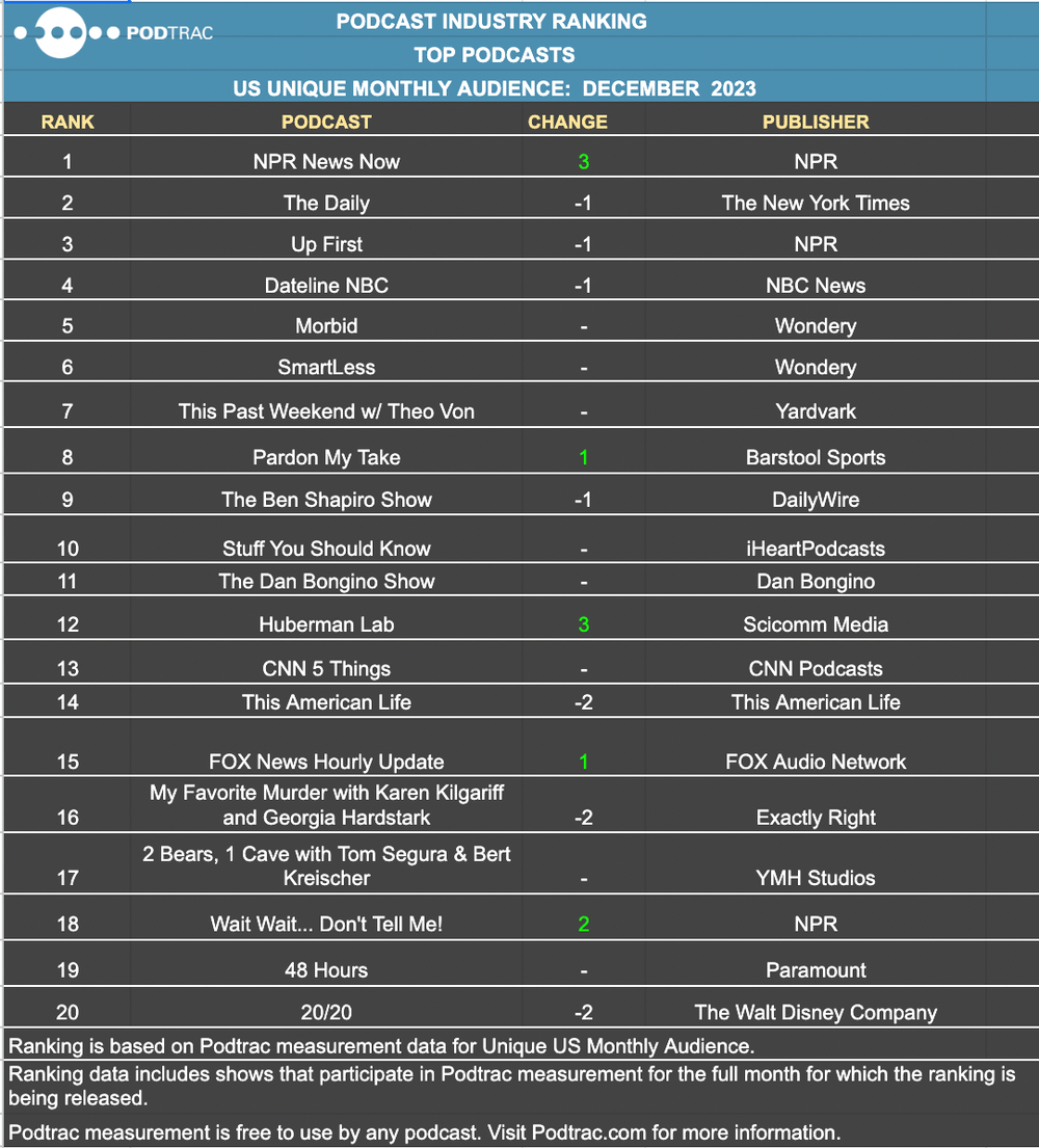 December's holiday disruptions and iOS 17's ongoing rollout are limiting podcasters' enjoyment of Podtrac's monthly update. Every publisher in the top 20 saw their unique monthly audience stabilise or decline. In December, top 20 global downloads fell 19% month-to-month and 24% year-over-year, according to Podtrac.