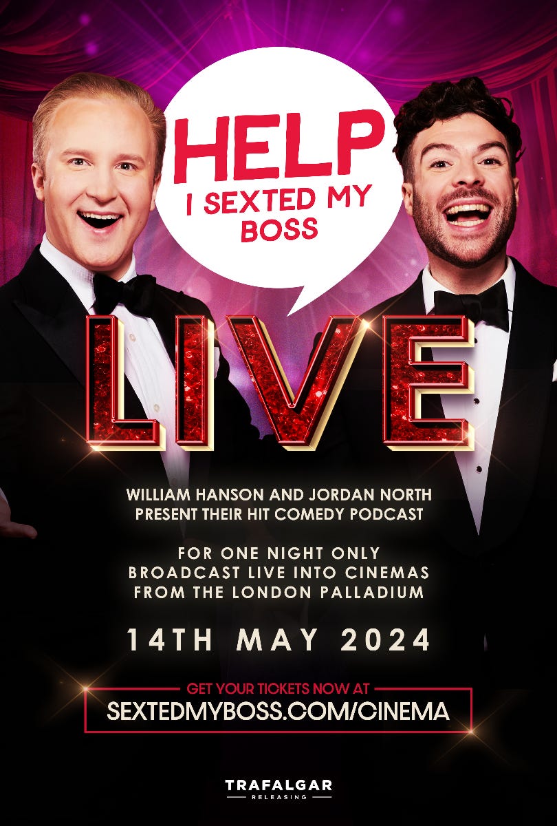 On sale today, William Hanson and Jordan North announce their podcast tour 'Help I Sexted My Boss LIVE' will be in 400 cinemas across the UK, Ireland and select European cities on Tuesday 14th May.