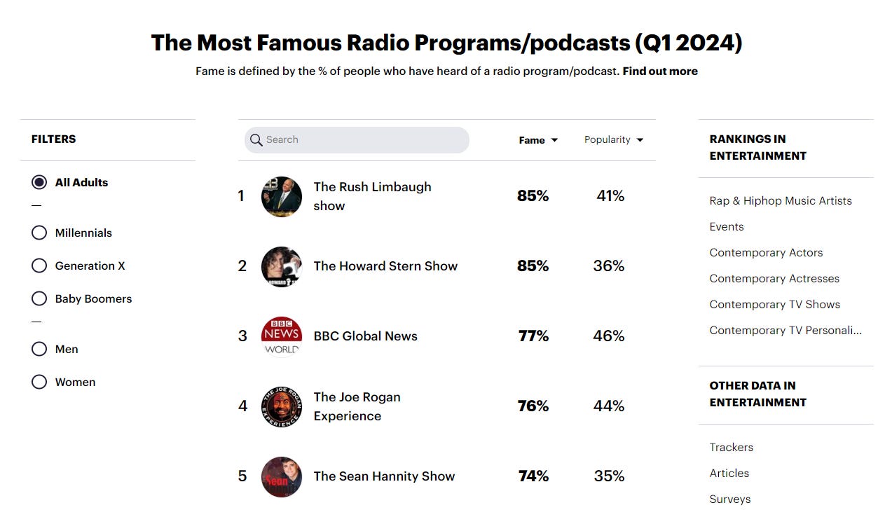 YouGov also ranked the percentage of people familiar with podcasters and radio shows. Limbaugh ranked first, with 85% of respondents familiar with the show even after years off the air. He was with SiriusXM's Stern, a key figure. Third, the BBC Global News podcast was recognized by 77% of global respondents. Rogan ranks fourth with 76% having heard of The Joe Rogan Experience. YouGov found 76% of respondents familiar with Premiere Radio's syndicated talker Sean Hannity, ranking No. 5.