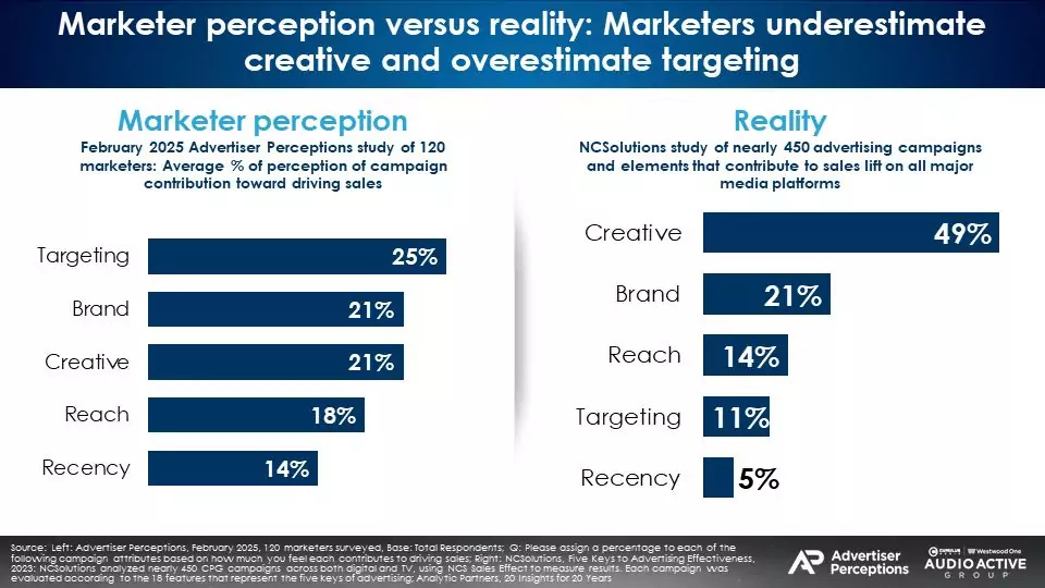 Nielsen research shows creative drives 50% of sales effect, yet Advertiser Perceptions data reveals marketers significantly underestimate creative impact while overstating targeting importance