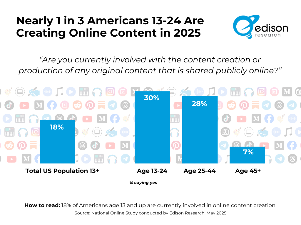 The Podwires Rundown: We talk endlessly about the creator economy like itâs some niche corner of the internet, but hereâs the reality check: nearly one in five Americans is already in the game. Edison Research just dropped data showing 18% of Americans 13 and older are actively creating and sharing original content online. Thatâs not passive scrolling â thatâs production. And before you assume itâs just Gen Z kids doing TikTok dances, think again. Among 25-44 year-olds, 28% are creating content. Thatâs Millennials with mortgages and kids, not just teenagers chasing viral fame. The creator economy isnât coming â itâs already here, and itâs bigger than most of us realized.