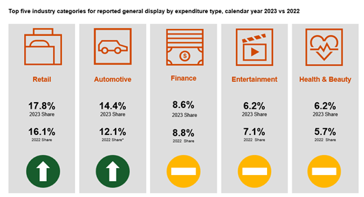 Across industry categories, health and beauty replaces FMCG in the top five industry categories for general display in 2023, with retail.