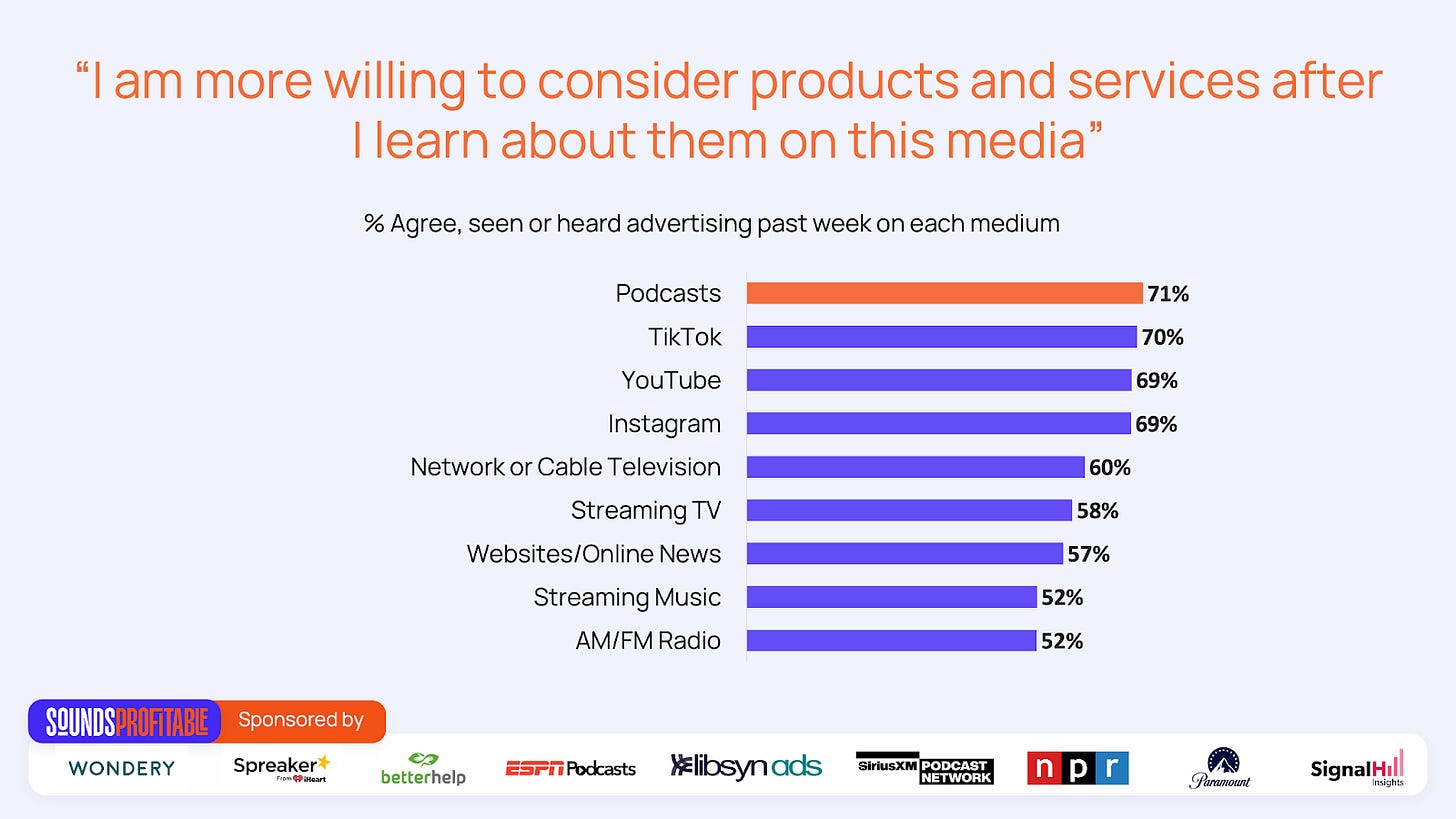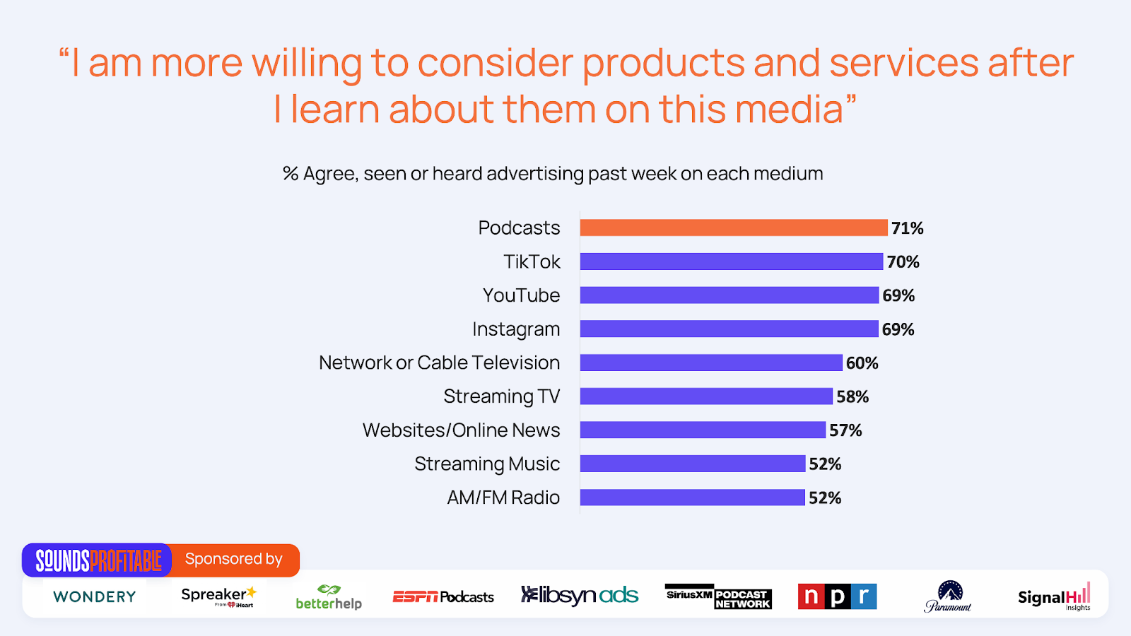 That value exchange is a pretty expansive topic – one we’ve been tackling over multiple studies over the past two years. Last year, The Medium Moves The Message looked at the comparative effectiveness of podcasting as an advertising vehicle compared to broadcast/cable TV and broadcast AM/FM radio and found that podcasting was significantly more effective in lower funnel (closer to purchase) measures than its broadcast counterparts.