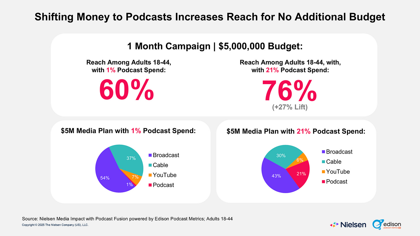According to Edison Researchâs Weekly Insights published October 1, 2025, the integration of Nielsen Podcast Fusion into Nielsen Media Impact represents the first time podcast listening data has escaped the silos of individual measurement systems. Presented at the IAB Podcast Upfronts, the new tool demonstrates how shifting ad dollars to podcasting can increase campaign reach without additional budget â showing a 27% reach growth among adults 18-44 when podcast spend increased from 1% to 21% of a sample media plan.