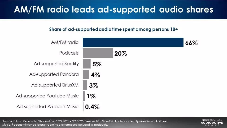 For podcasters and producers, these findings should fundamentally change how you position your shows to advertisers. Youâre not some experimental digital audio play â youâre commanding one-fifth of all ad-supported audio consumption in America, more than quadruple Spotifyâs actual ad-supported share. Thatâs your opening line. The actionable move here is arming yourself with this Edison data when talking to buyers whoâve been pitched fantasy numbers by streaming services. Show them the 20% share. Show them youâre the only digital audio format breaking double-digits in cars among younger demos. Show them that smart speaker listening puts podcasts ahead of every streaming service except AM/FM radio. The industry benefits when podcasting stops getting lumped into a generic âdigital audioâ bucket with services that have dramatically smaller actual audiences. Weâre not fighting for digital audio scraps â weâre the second-largest ad-supported audio medium in America. Start acting like it. And for producers looking at cross-platform strategies, understanding that 70% of America isnât reached by digital-only plans means partnerships with AM/FM radio arenât just nice-to-have, theyâre essential for true scale. The data is finally on our side. Use it.