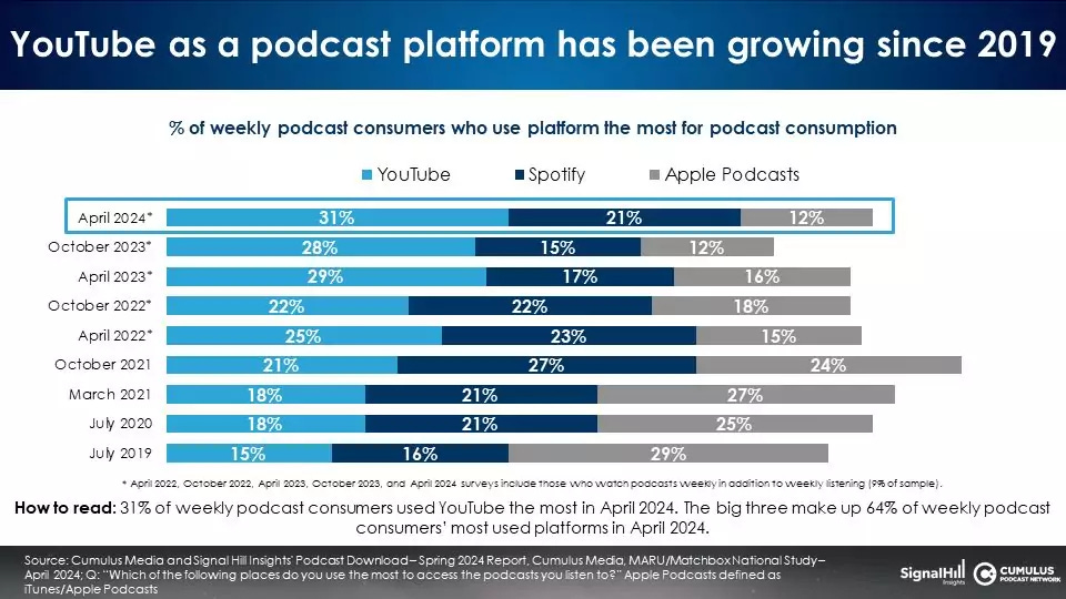 The Cumulus Media and Signal Hill Insights' Podcast Download – April 2024 Report, conducted twice a year, surveyed 603 nationally representative respondents aged 18+ who spent at least one hour listening to or watching podcasts within the past week, and were not employed in any industries.