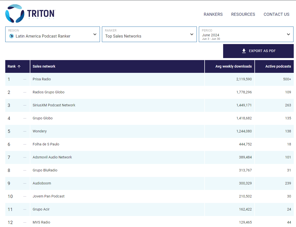 Leading, technology, and services provider to the podcast, digital audio, and broadcast radio industries, Triton Digital just announced the release of the first-ever Latin America Sales Network Podcast Ranker. The report will leverage Triton's Podcast Metrics measurement service to provide insight into the top 12 sales networks.