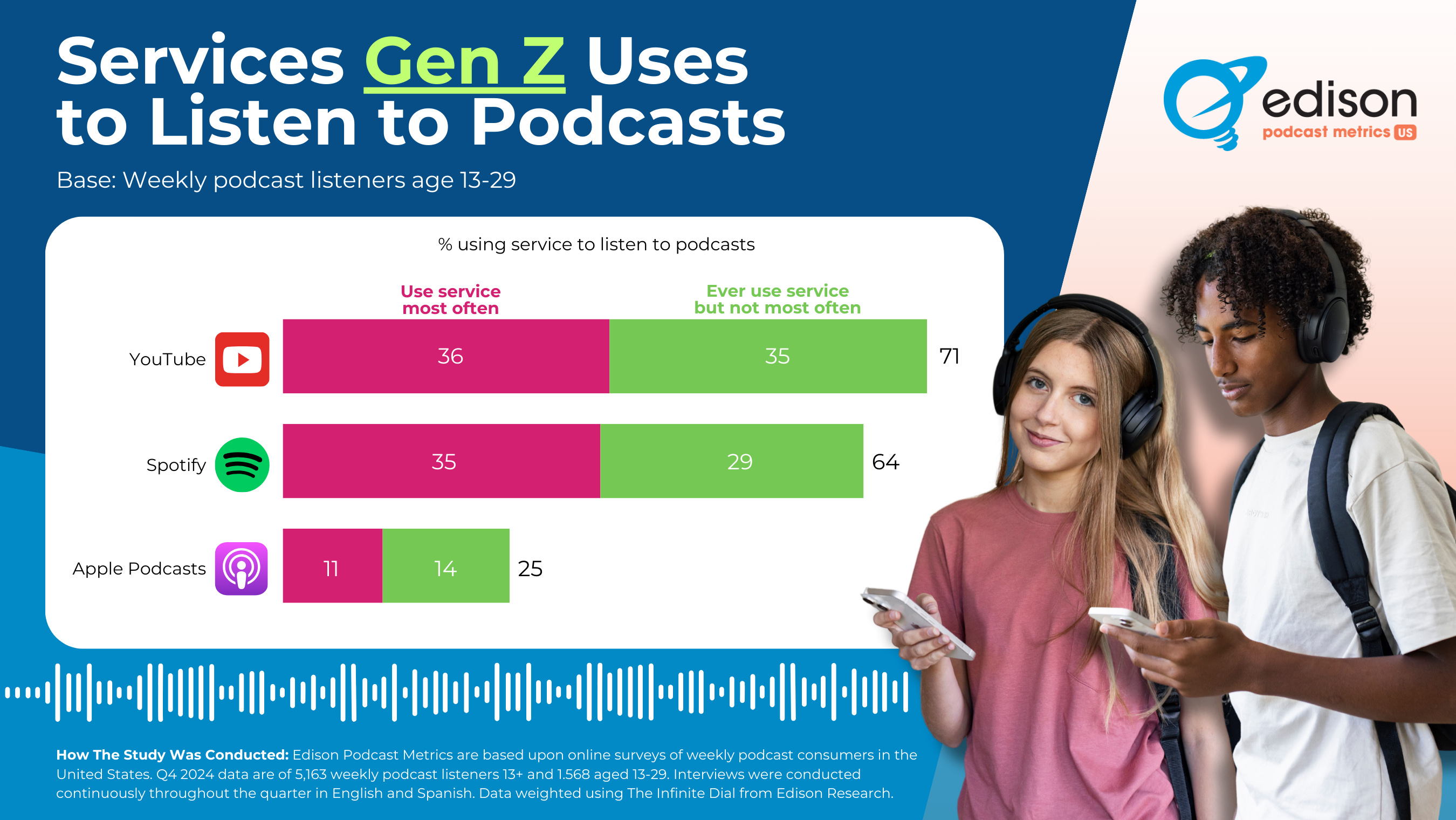 Edison Podcast Metrics' robust methodology shows that YouTube marginally outperforms Spotify as Gen Z's preferred podcast platform, contradicting Transistor's findings. Edison's quarterly collection of 5,000+ surveys from a nationally representative sample has much higher statistical validity than Transistor's 100+ interviews from self-selected digital channels, highlighting the importance of sample methodology in podcast consumption research.
