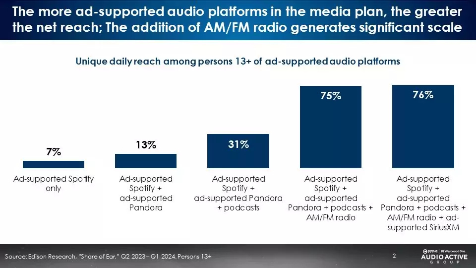 It found out that, on an average day, ad-supported digital audio reached one in three Americans, while two in three Americans were reached by AM/FM radio. In all, digital audio and AM/FM radio together reach 75% of the U.S. daily; podcasts and AM/FM radio comprise almost 90% of all tuning minutes.