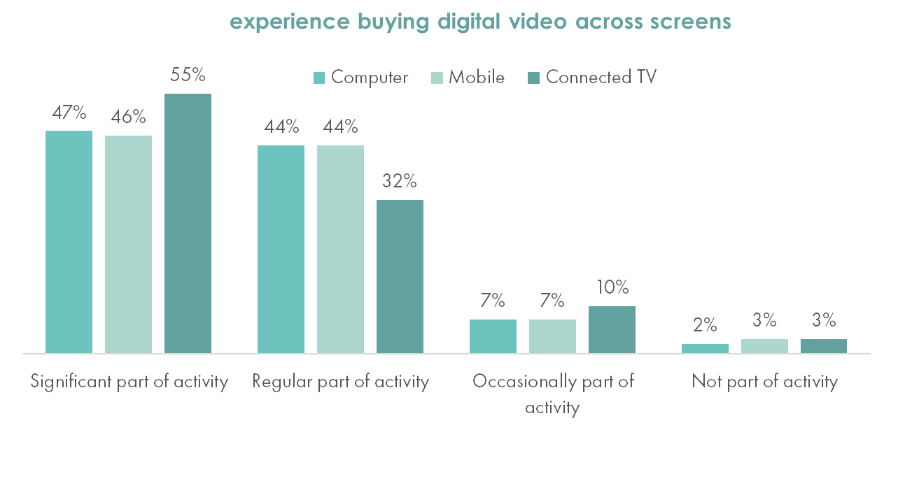 Other major drivers for digital video advertising include reaching as such and extending reach from linear TV, targeting/personalization. Connected TV uses are mostly driven by brand building, while video on a mobile or computer is used for pricing. A screens planning approach involves strategically considering different types of screens to carry out advertising campaigns so that there would be full and targeted coverage. This way, the agencies could optimize their advertising strategies considerably across different screens.