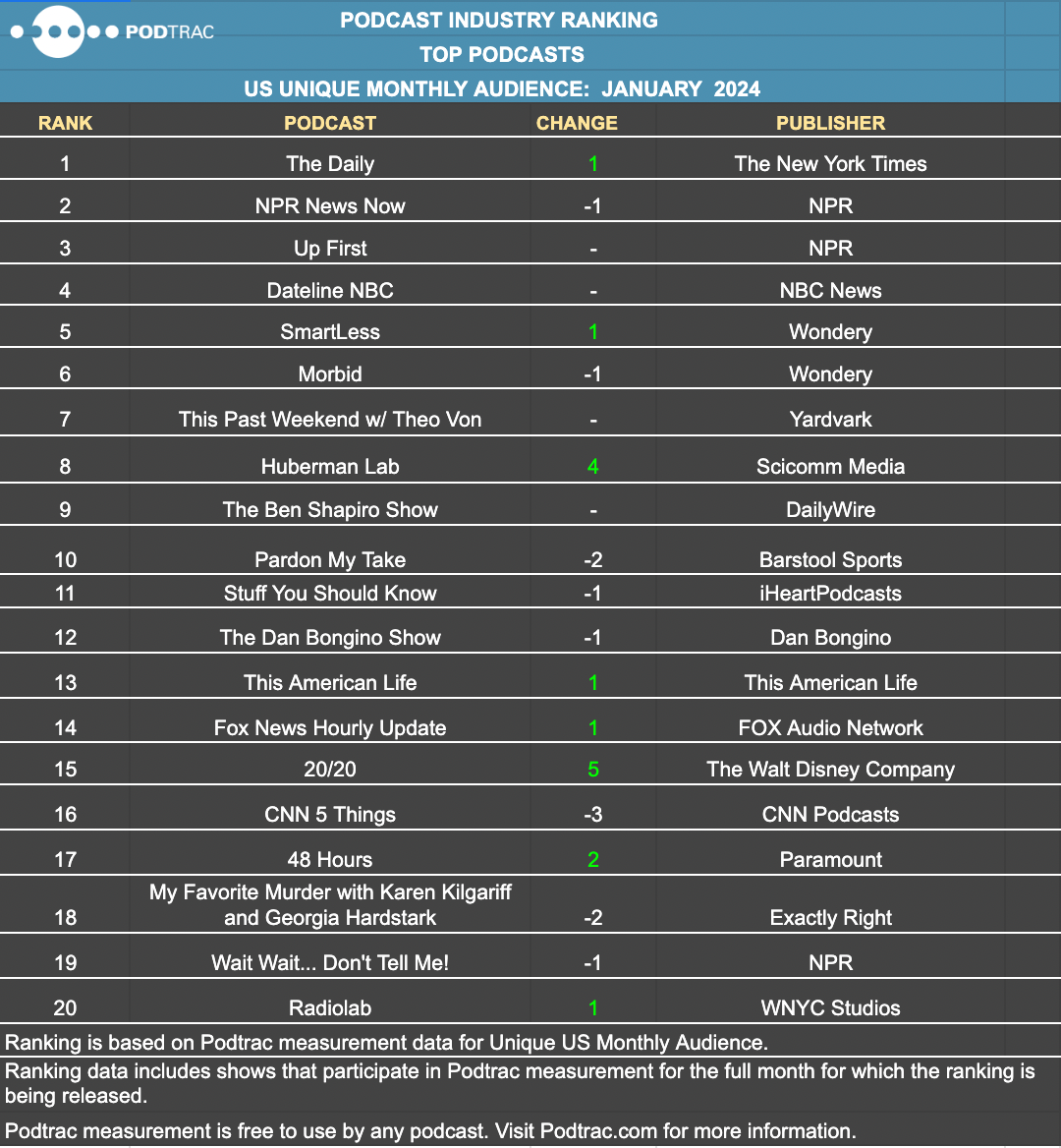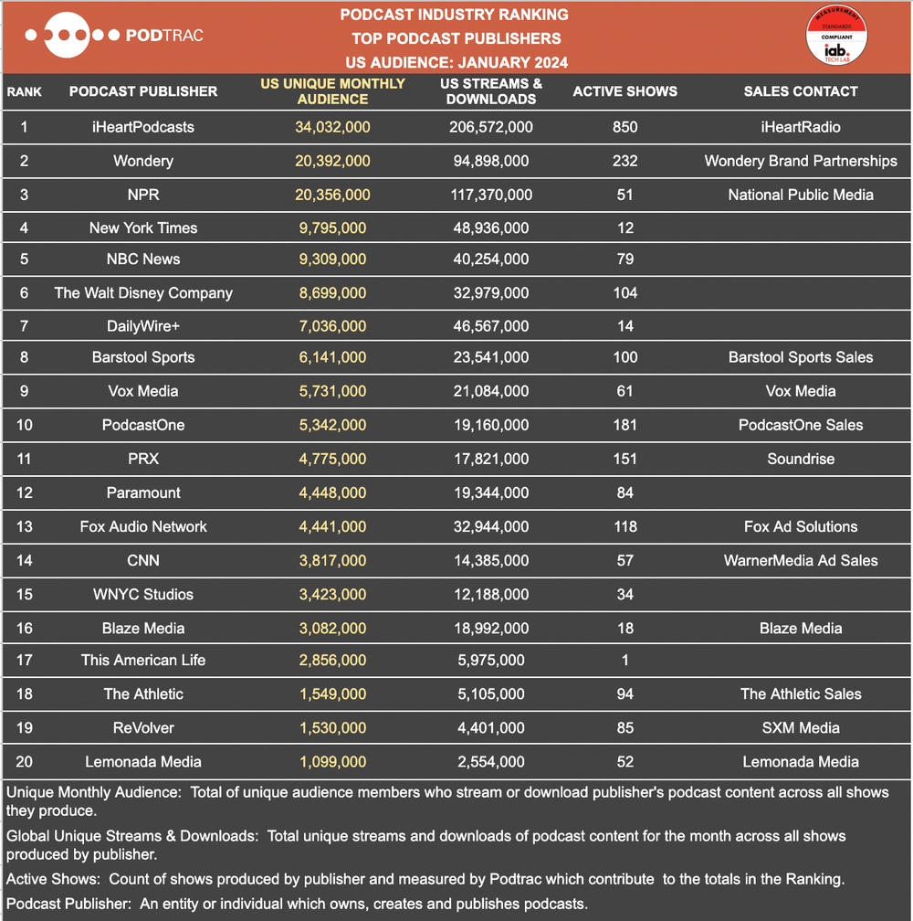 🎧Podtrac release the Top Podcast Publishers and Top Podcasts rankings for January