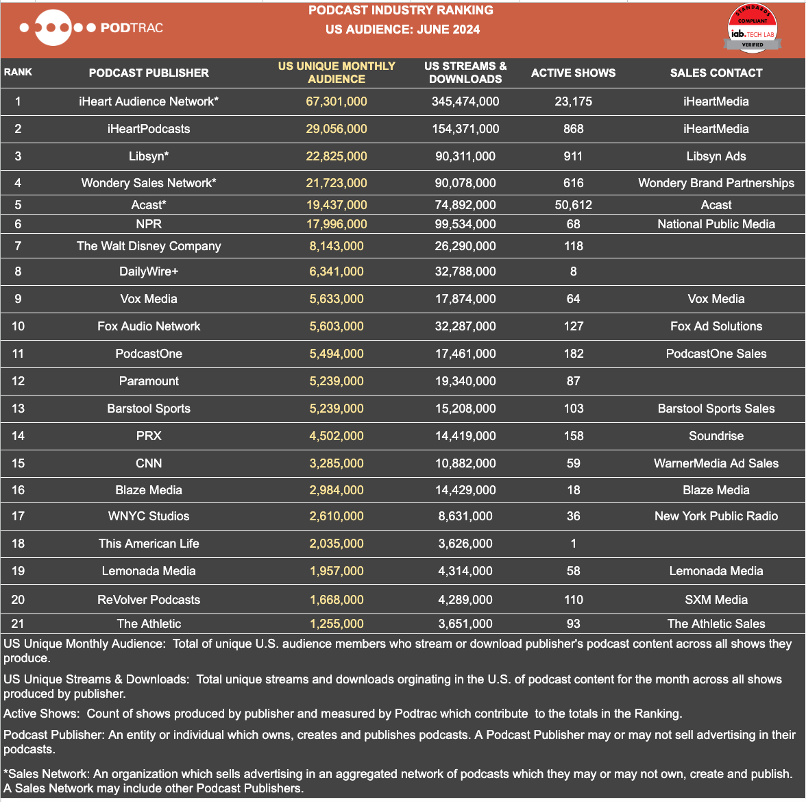The Top US and Global Publishers & Networks and Top US Podcast rankings for June are now live on www.Podtrac.com.