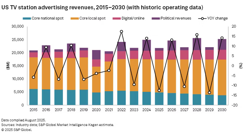 The Data : S&P Global Market Intelligenceâs comprehensive Broadcast Outlook 2025, authored by Justin Nielson and released October 7, projects a brutal contraction for traditional broadcast media over the next five years. TV station ad revenue will decline 12.5% to $21.81 billion in 2025, with national spot revenue dropping 4.3%. Radio faces similar headwinds, with national spot ad revenue declining 5.0% to $1.76 billion in 2025. However, the report identifies podcasting as a critical growth engine, with S&P Global Market Intelligence Kagan projecting podcast ad revenue to surge 22% in 2025, crossing the $1 billion threshold for the first time.