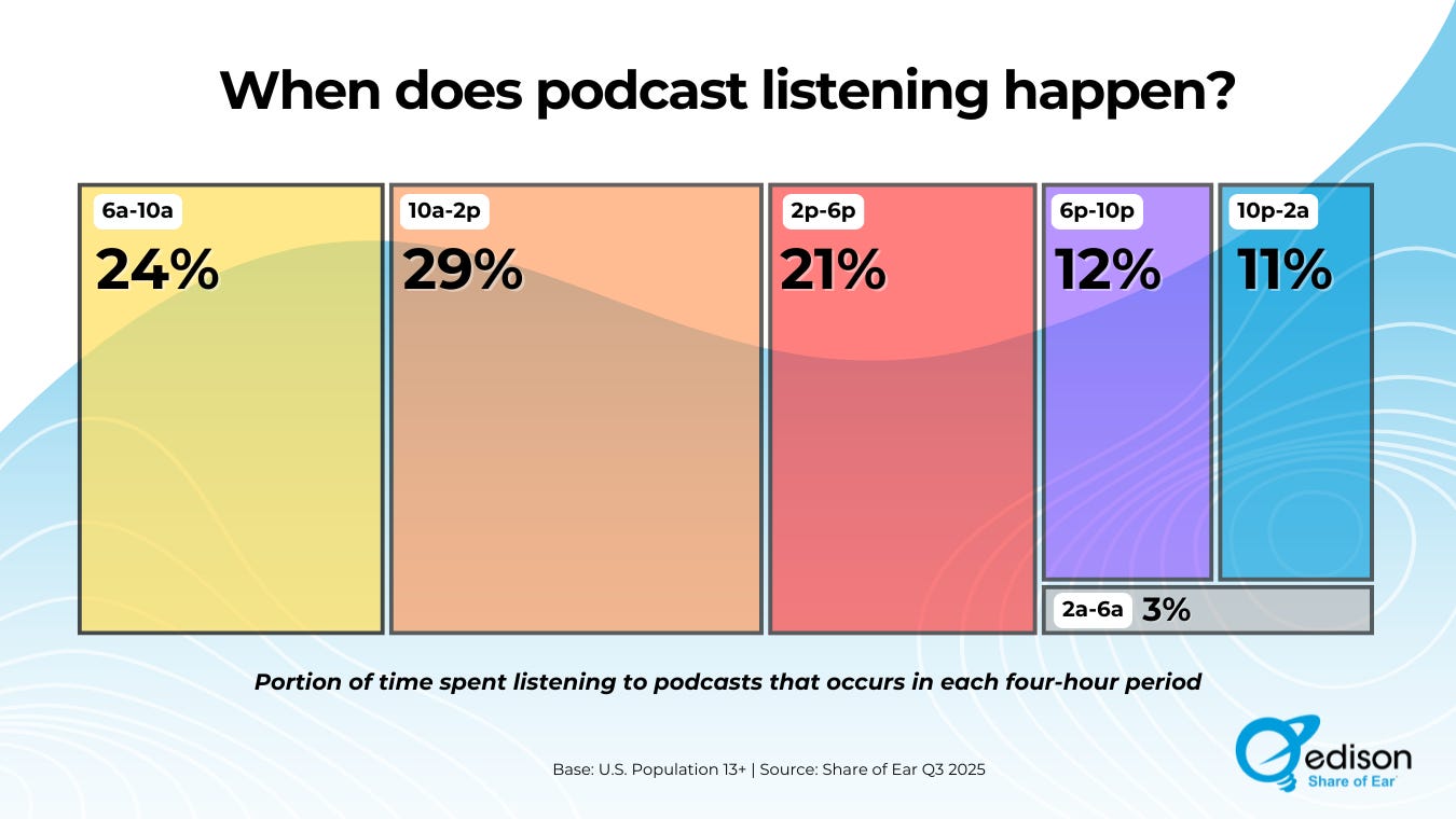The Data :Edison Researchâs Q3 2025 Share of Ear study, scheduled for full release to subscribers next week, reveals that Americans age 13+ spend 10% of their total daily audio time listening to podcasts. The study tracked podcast consumption patterns across all dayparts among the 13+ demographic, providing the most comprehensive picture of when podcast listening actually occurs throughout the day.
